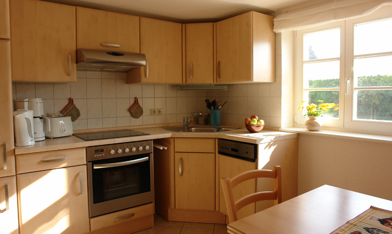 - Küche mit Kühlschrank, Kaffeemaschine, Toaster, Wasserkocher, Spülmaschine, Backofen und Ceran-Kochfeld